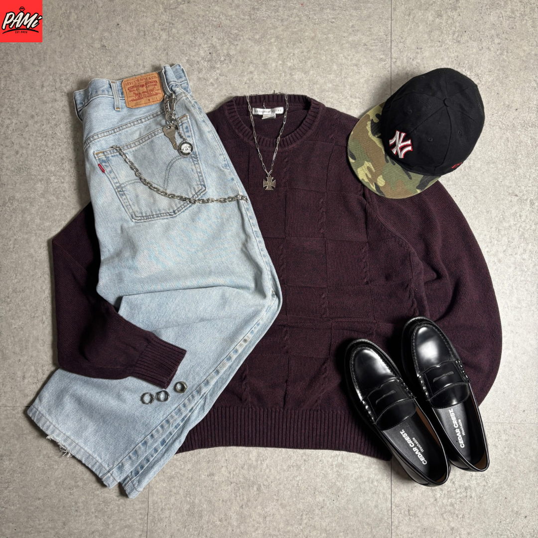 バーガンディニットシティボーイコーデ古着
